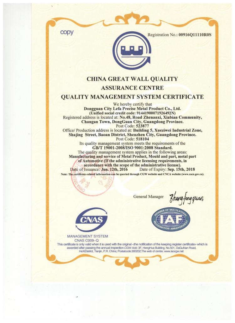 公司通过全员参与,全员努力做好每一个细节,顺利通过新能源汽车厂商验厂和ISO认证,现正全力配合客户赶货中,乐发期待您的关照和支持,专注高精密,高要求,高难度铝合金,锌合金压铸件模具设计研发和产品生产一条龙配套,乐发品质你值的拥有!