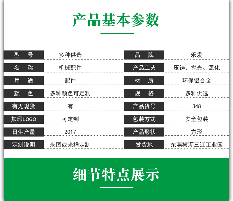 本款配件采用的是环保铝合金材质,铝合金是工业中应用最广泛的一类有色金属结构材料,在航空、航天、汽车、机械制造、船舶 及化学工业中已大量应用。工业经济的飞速发展,对铝合金焊接结构件的需求日益增多,使铝合金的焊接性研究也随之深入。目前铝合金是应用最多的合金。