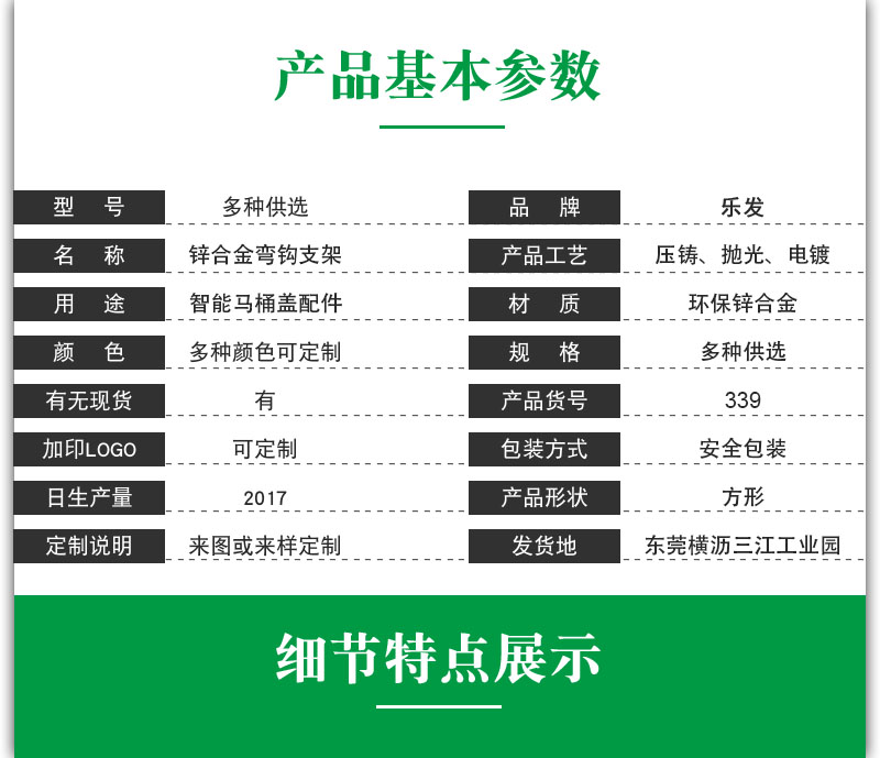 本款智能马桶盖支架配件是锌合金材质。锌合金是以锌为基础加入其他元素组成的合金。常加的合金元素有铝、铜、镁、镉、铅、钛等 低温锌合金。锌合金熔点低,流动性好,易熔焊,钎焊和塑性加工,在大气中耐腐蚀,残废料 便于回收和重熔;但蠕动强度低,易发生自然时效引起尺寸变化。熔融法制备,压铸或压力加 工成材。