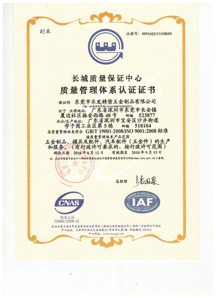公司通过全员参与,全员努力做好每一个细节,顺利通过新能源汽车厂商验厂和ISO认证,现正全力配合客户赶货中,乐发期待您的关照和支持,专注高精密,高要求,高难度铝合金,锌合金压铸件模具设计研发和产品生产一条龙配套,乐发品质你值的拥有!